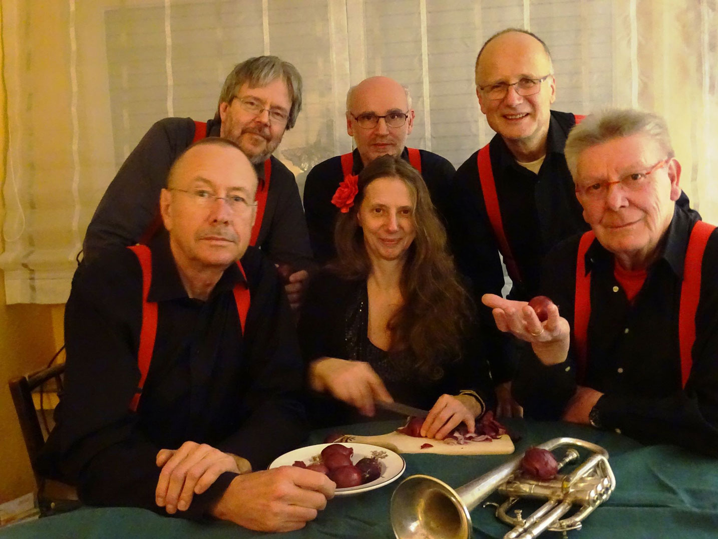 Red Onion Hot Jazz klein„Red Onion Hot Jazz“ spielt seit 2004 klassischen New Orleans Jazz in der traditionellen Besetzung Kornet, Posaune, Klarinette/Saxophon, Banjo/Gitarre, Kontrabass/Tuba und Piano.